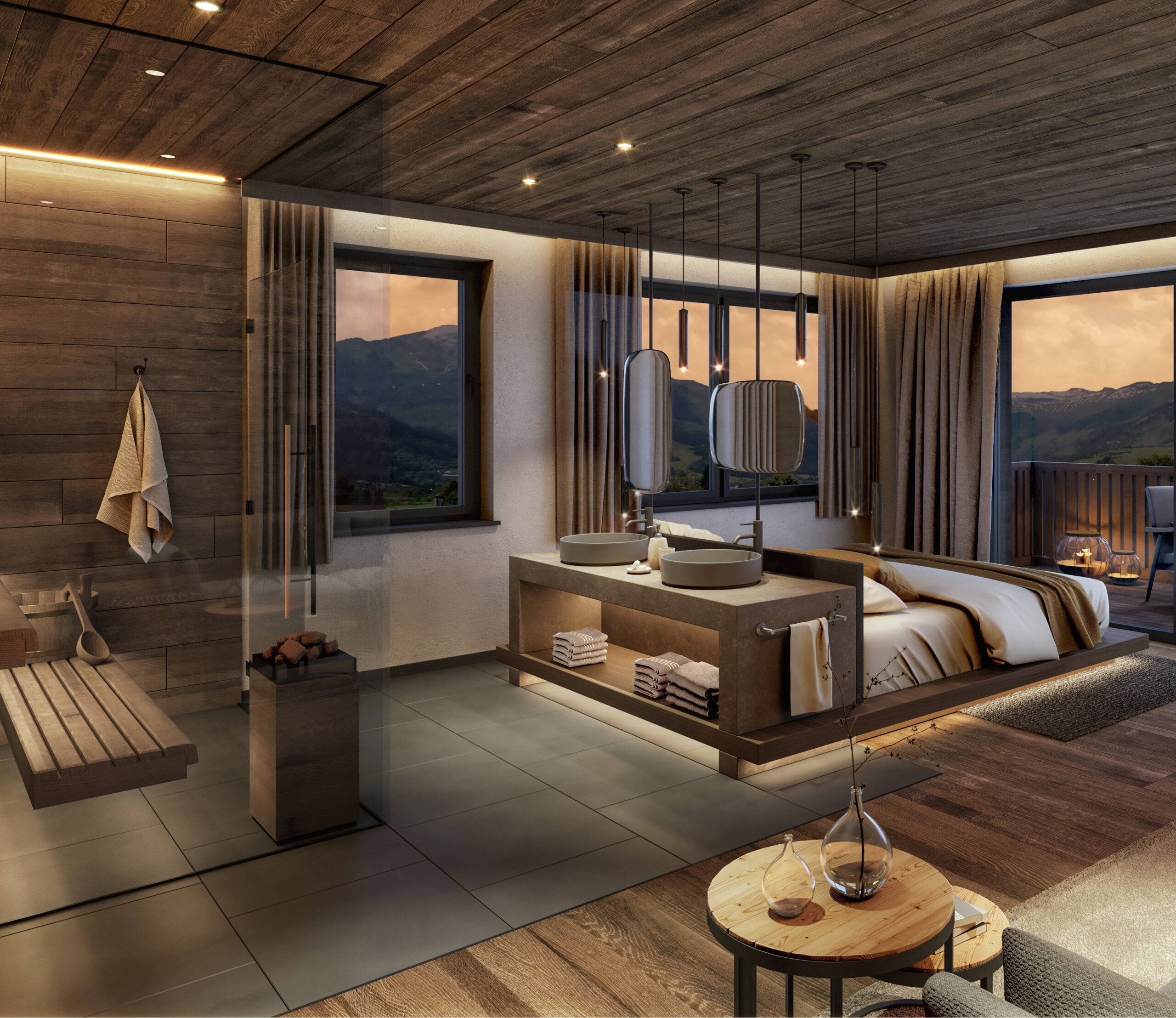 Privatsphäre wird ganz groß geschrieben. In jeder der 12 Lodges findet man eine private Sauna (ein XXL 40M² Wellness Bereich ist Optional), einen Hot-Pot aus Edelstahl zum Relaxen und Abschalten und einen Kaminofen für gemütliche Stunden vor dem knisternden Feuer. Luxus, Komfort und die einzigartige Lage zeichnen die Lodges aus. Hochwertige Möbel vom Tischler und ausgewählte Materialien machen IHRE Lodge zu einem unvergleichlichen Hideaway. Auf Wunsch wird den Gästen das Frühstück in die Lodge oder Frühstück Restaurant serviert. Die Rezeption mit heller Lobby und Kamin nimmt die Gäste herzlich in Empfang. Zur Gewährleistung einer komfortablen Parksituation steht den Gästen eine Tiefgarage mit XXL Parkplätze und Ladestationen für Elektroautos zur Verfügung.